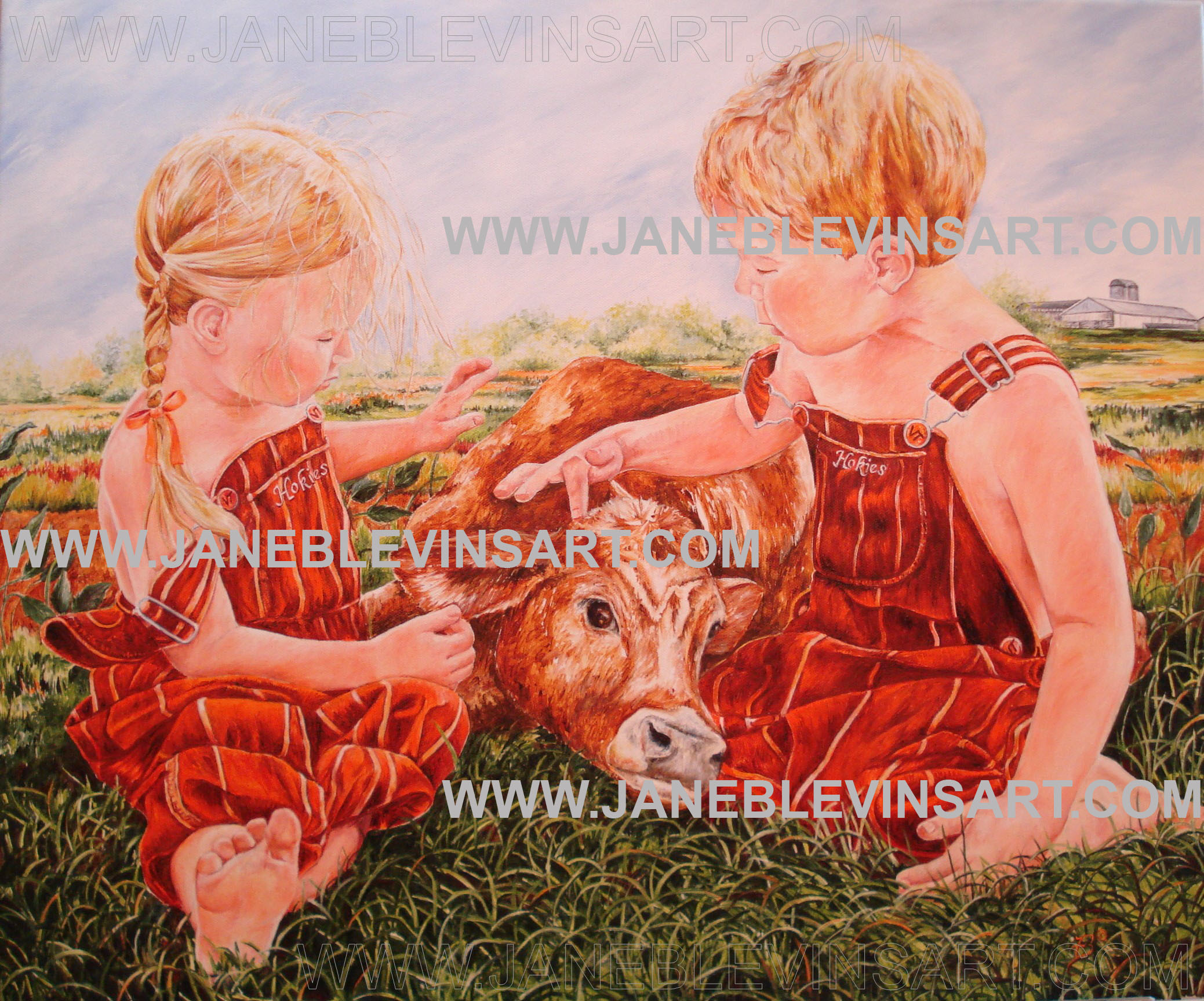 Licensed by Virginia Tech, "Divine Hokie Bovine" features two young children with a calf. The Virginia Tech Dairy Complex is featured in the background.
