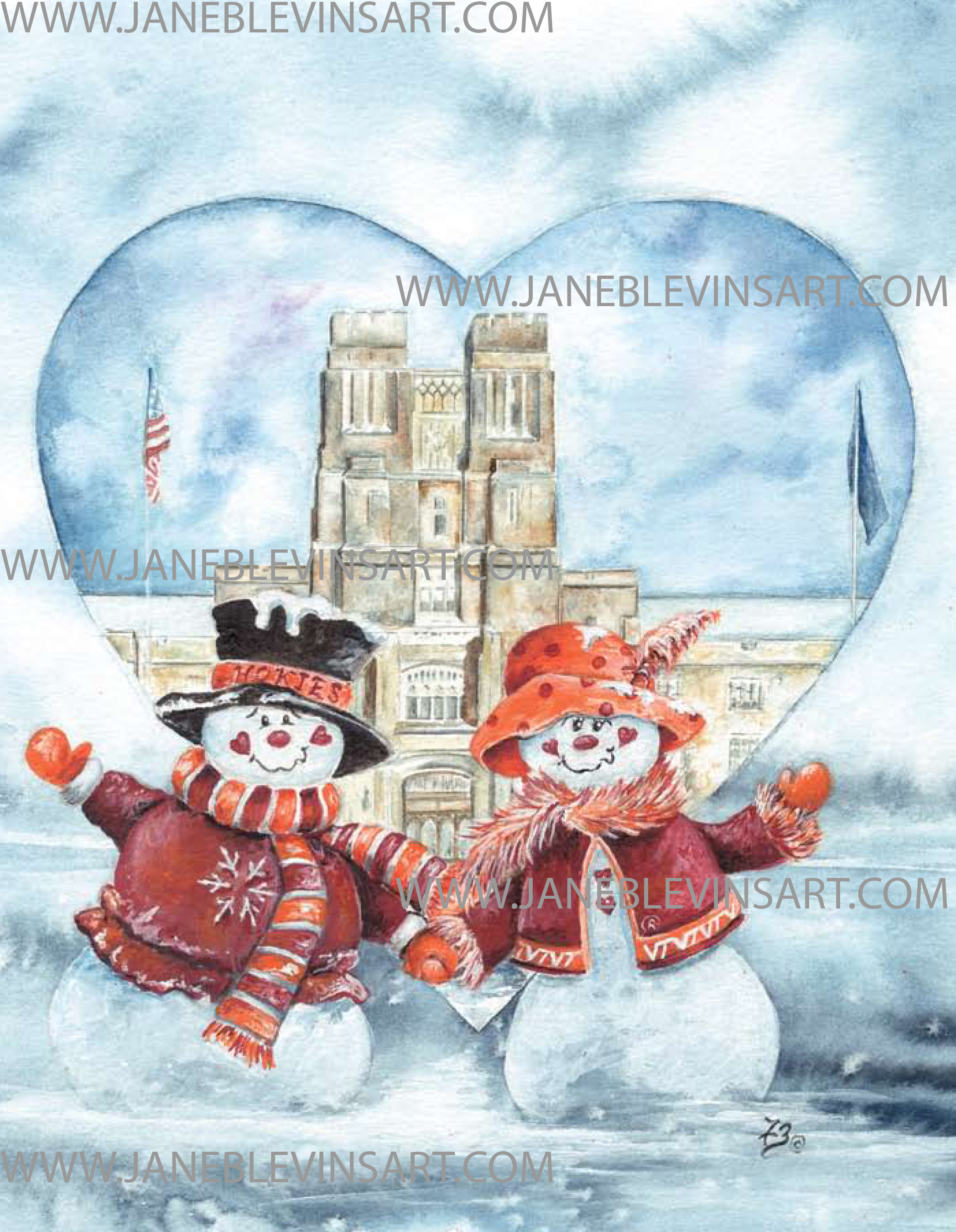 Licensed by Virginia Tech, "Heart of Stone" features two snowmen with Burruss Hall in the background.