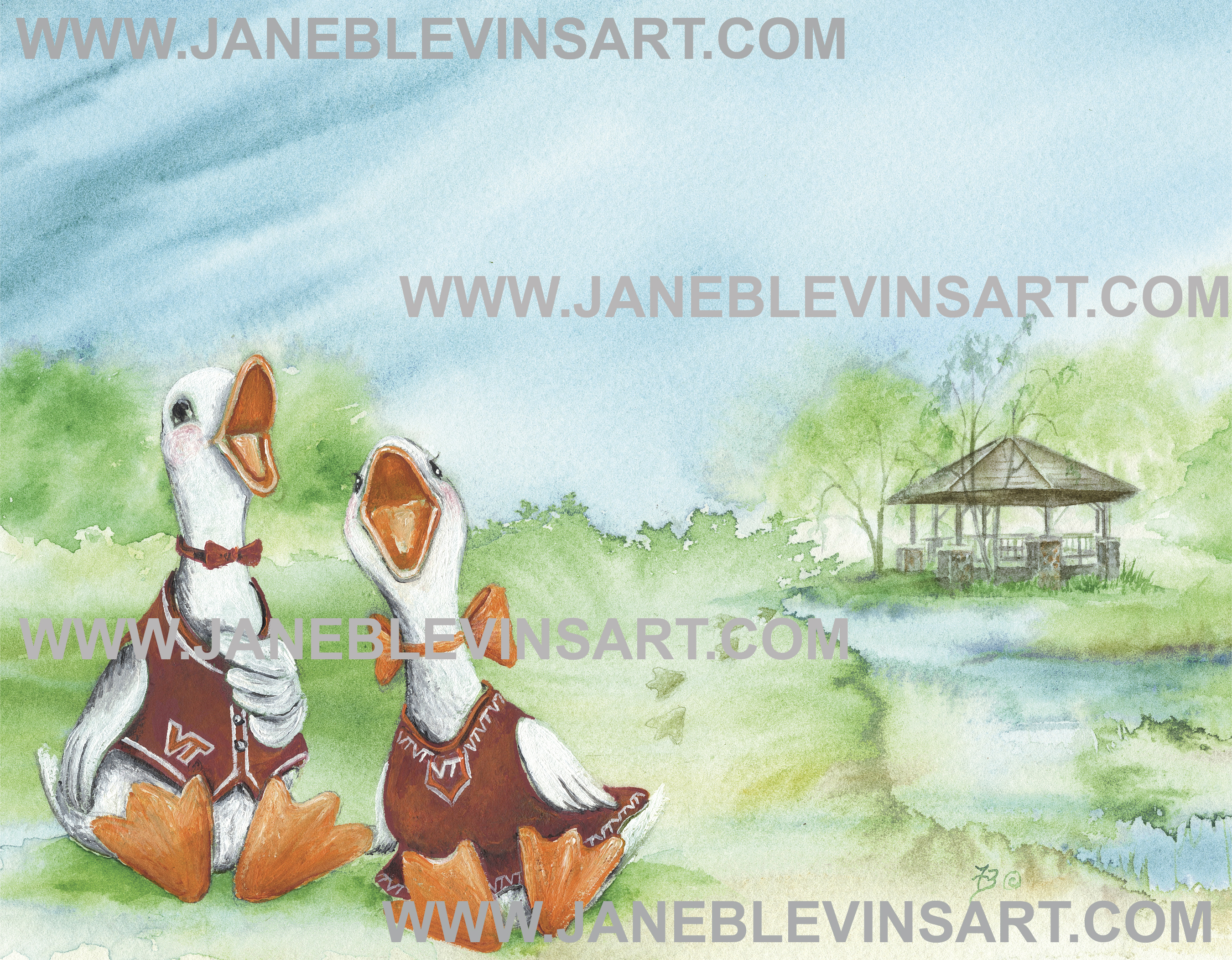 Licensed by Virginia Tech, "Hokie Harmony" features two ducks at the duck pond on Virginia Tech's campus.