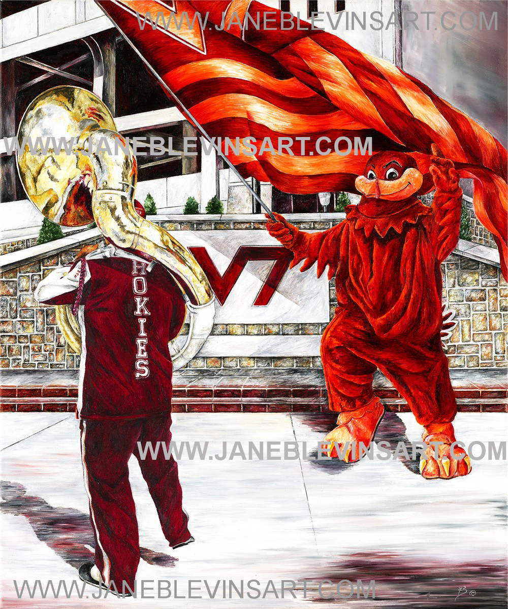Licensed by Virginia Tech, "The Hokie Pokey" features a Virginia Tech band member and the Hokie Bird. Lane Stadium is featured in the background. 10% of every print sold will be donated to the memorial fund that has been created in honor of Ryan "Stack" Clark, who was lost in the April 16th tragedy.