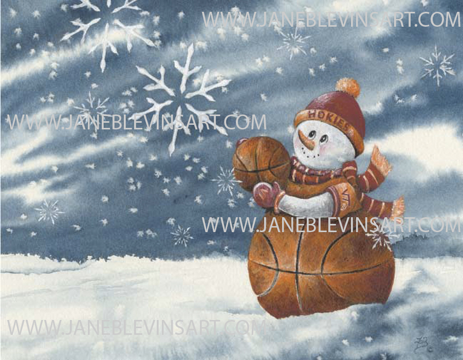 Licensed by Virginia Tech, "Hokie Snow" features a snowman with a basketball and snowflakes made out of hokie tracks.