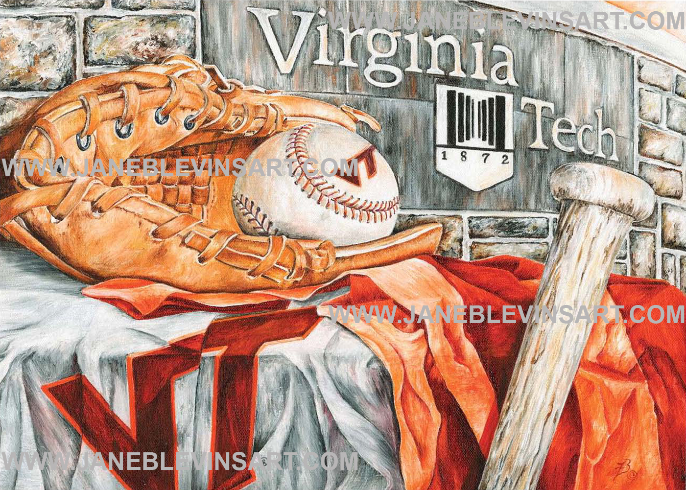 Licensed by Virginia Tech, "Home Run Hokies" features a Virginia Tech baseball, glove and bat with Hokie stone in the background.