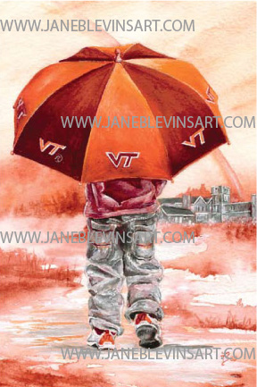 Licensed by Virginia Tech, "Rain or Shine" features a child with a Virginia Tech umbrella looking toward Holtzman Alumni Center.